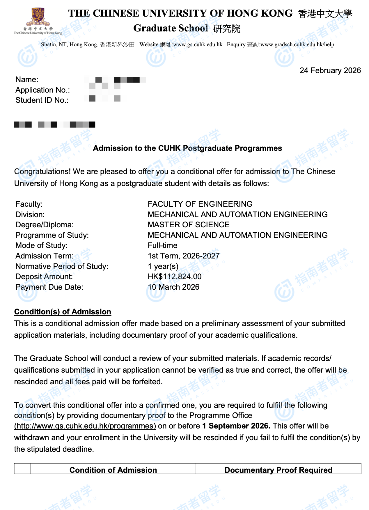 香港中文大學(xué)機(jī)械與自動(dòng)化工程理學(xué)碩士研究生offer一枚