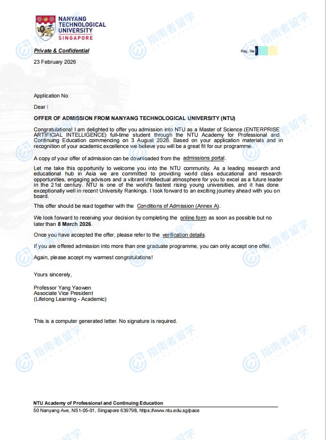 南洋理工大學(xué)企業(yè)人工智能理學(xué)碩士研究生offer一枚