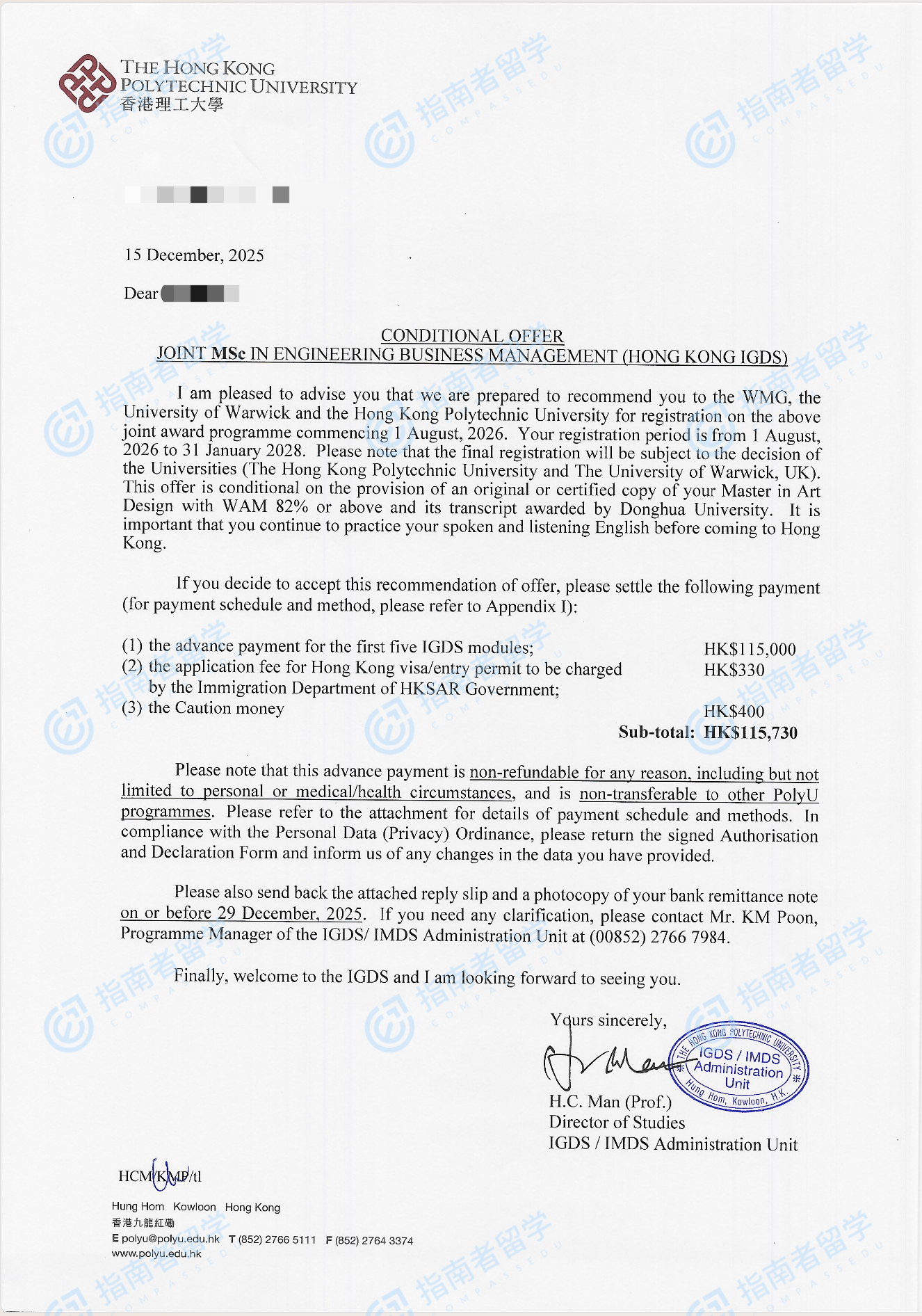 香港理工大學(xué)工程商業(yè)管理理學(xué)碩士研究生offer一枚