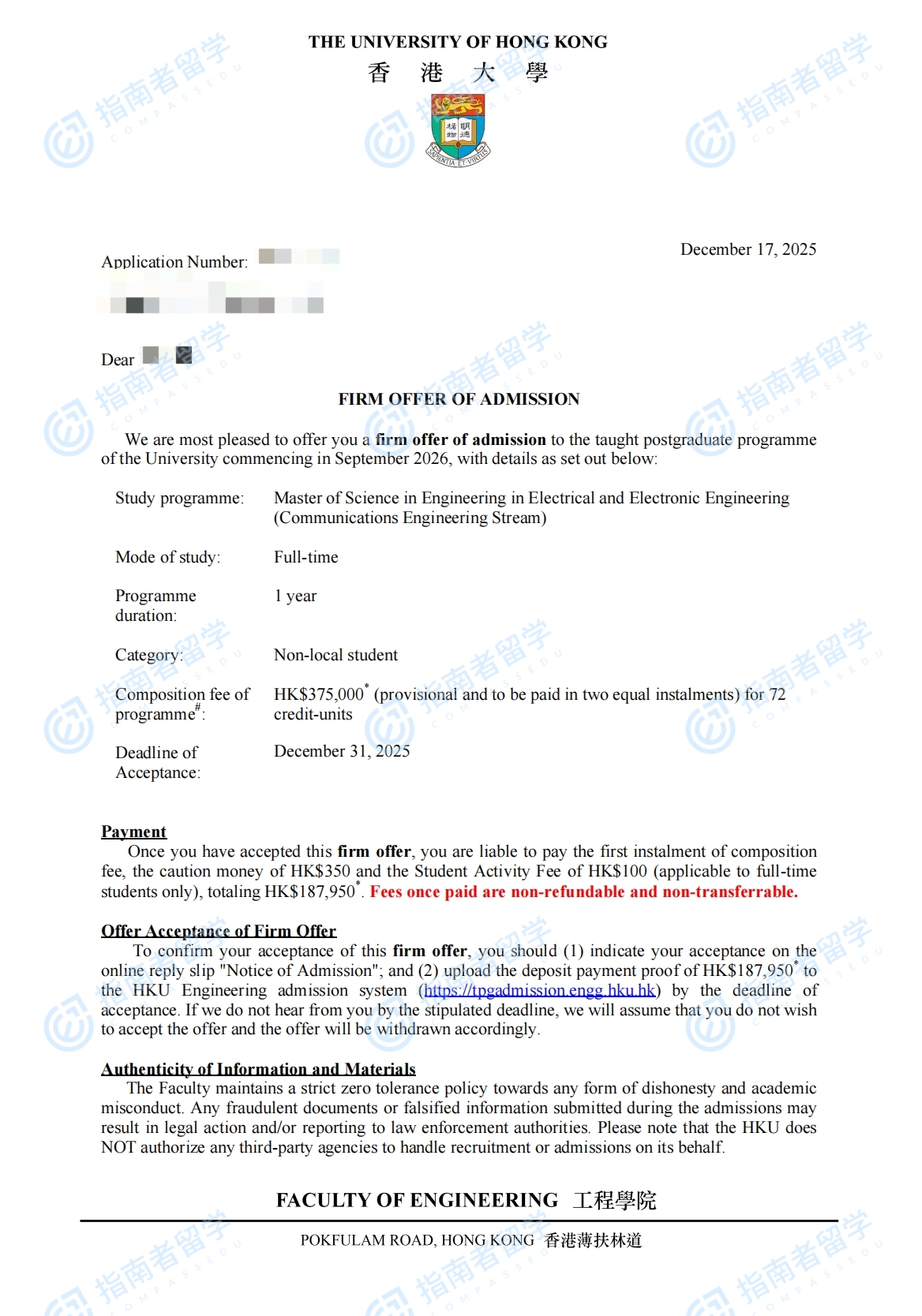 香港大學(xué)電氣與電子工程(工程)理學(xué)碩士 - 通信工程方向研究生offer一枚