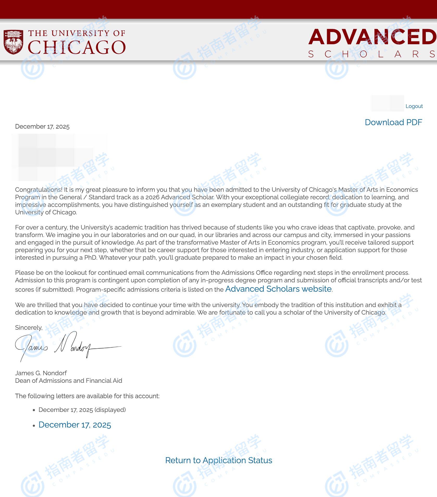 芝加哥大學經(jīng)濟學文學碩士研究生offer一枚