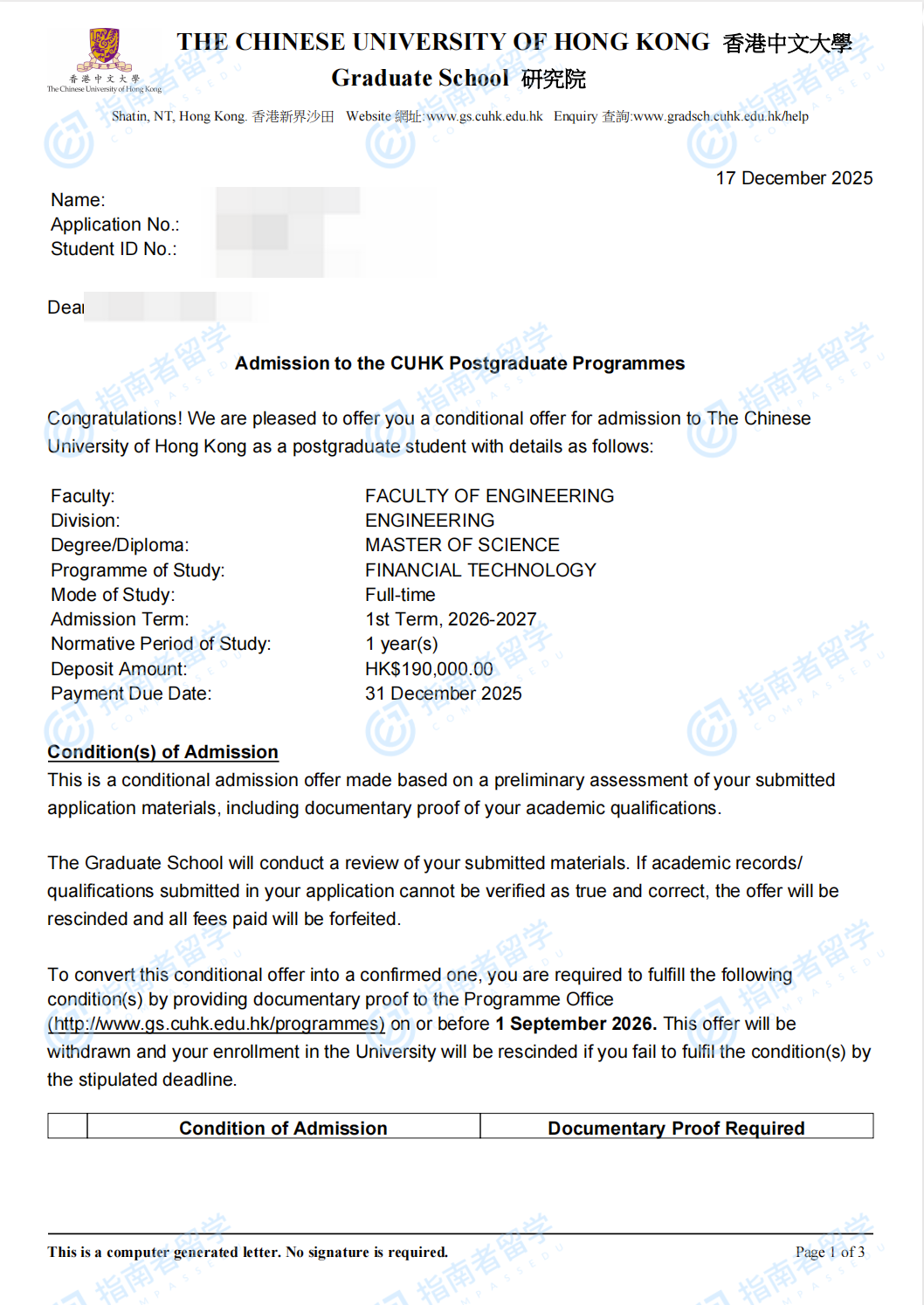 香港中文大學(xué)金融科技理學(xué)碩士研究生offer一枚