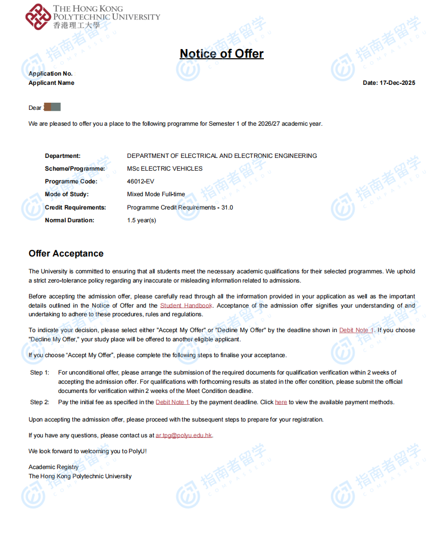 香港理工大學(xué)電動(dòng)汽車?yán)韺W(xué)碩士研究生offer一枚