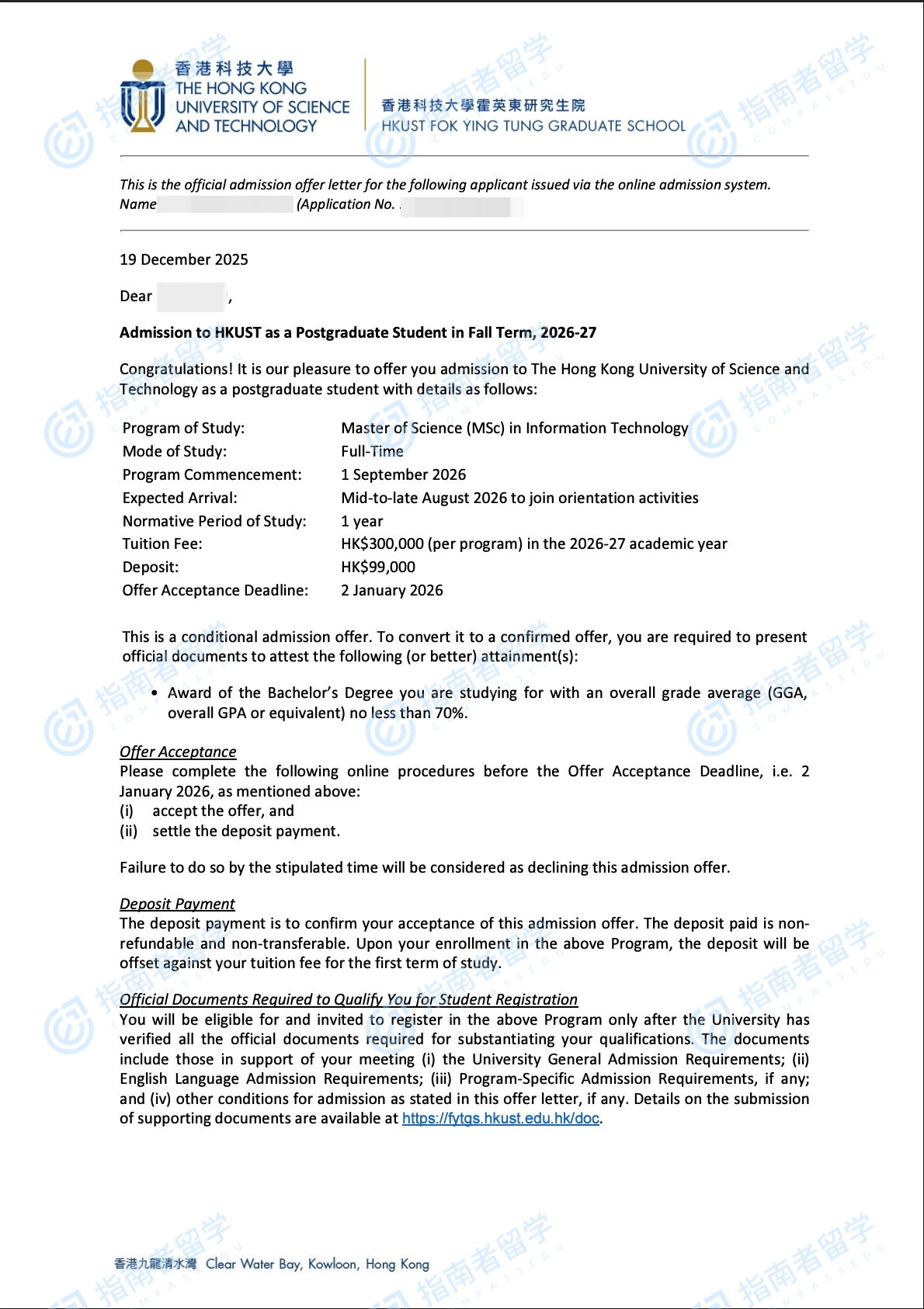 香港科技大學(xué)信息技術(shù)理學(xué)碩士研究生offer一枚