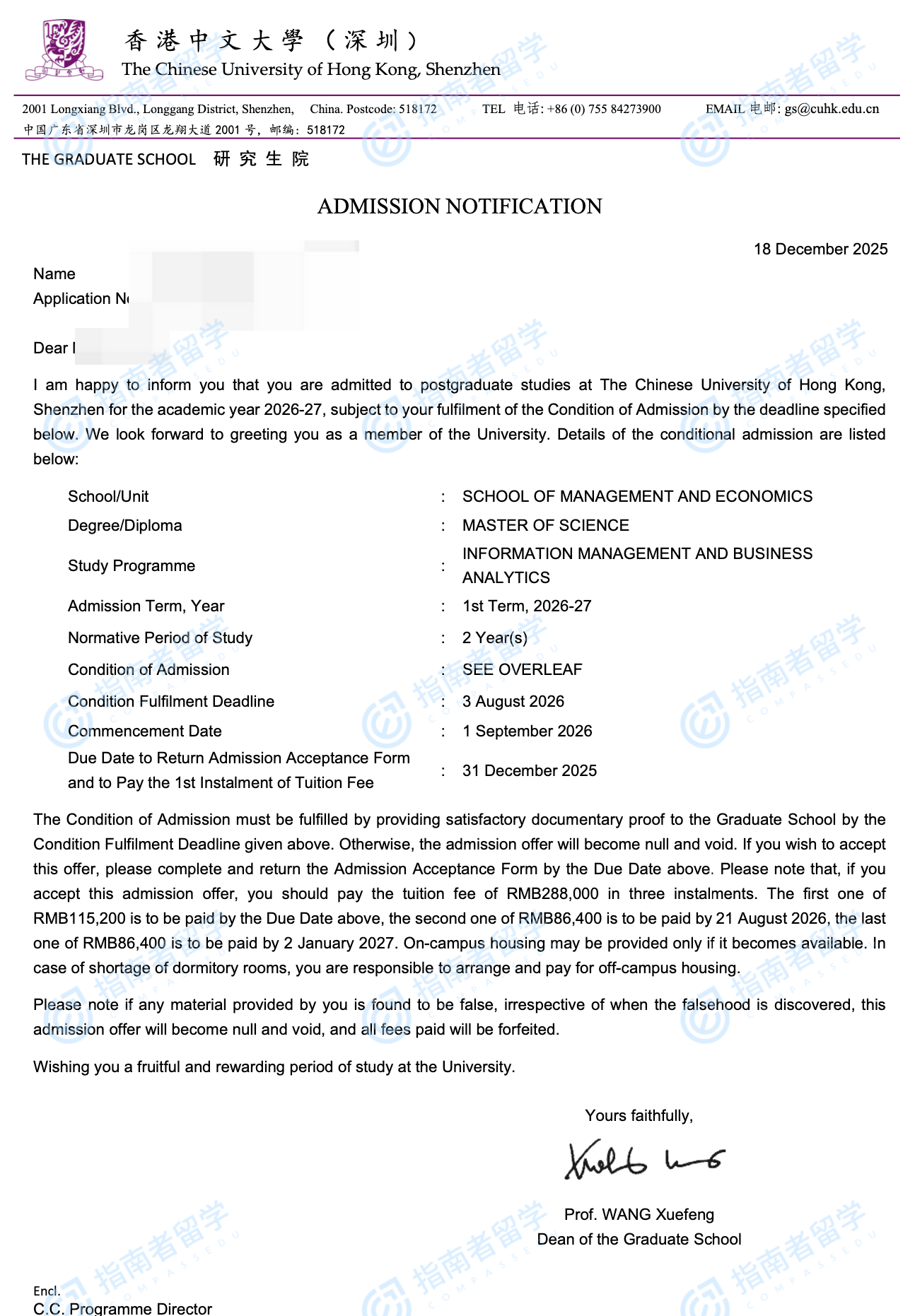 香港中文大學(xué)信息管理 & 商業(yè)分析理學(xué)碩士(CUHK-Shenzhen)研究生offer一枚