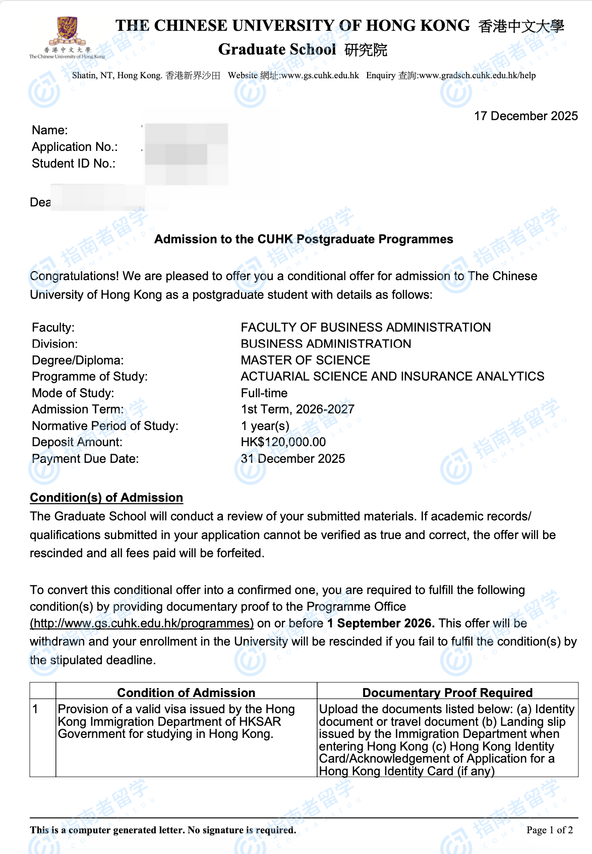 香港中文大學精算學與保險分析理學碩士研究生offer一枚