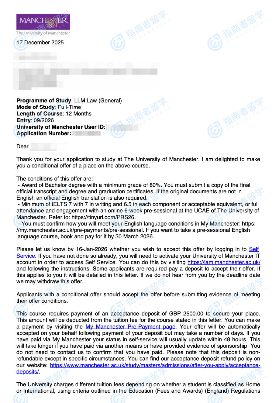 曼徹斯特大學(xué)法學(xué)碩士研究生offer一枚