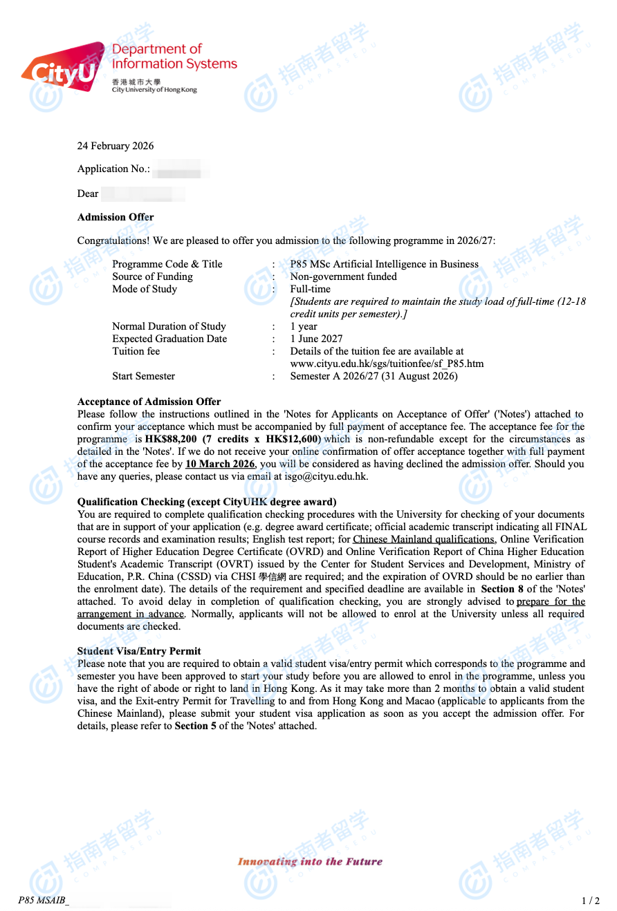 香港城市大學(xué)商業(yè)人工智能理學(xué)碩士研究生offer一枚